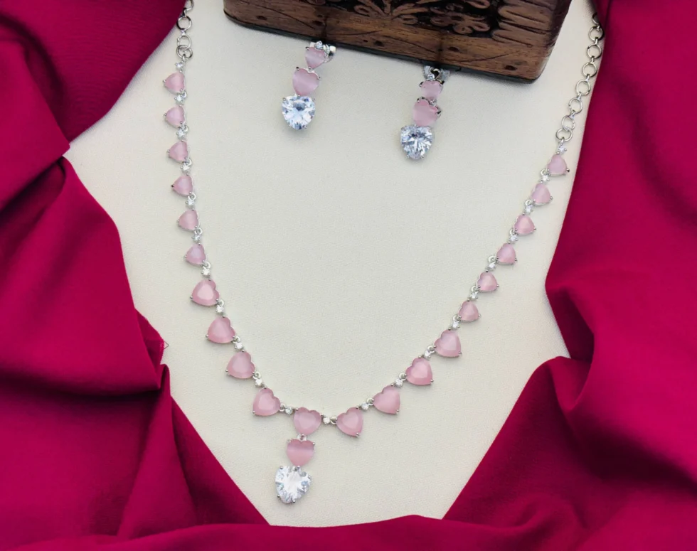 Each piece in this set — from the finely structured necklace to its perfectly matched earrings — exudes sophistication. The heart-patterned stones reflect love and delicacy, while the luminous white American Diamonds (Cubic Zirconia stones) bring a radiant brilliance that mimics real diamonds. Set in high-quality rhodium silver plating, the piece shines beautifully while maintaining a refined, modern touch. The gentle contrast between the soft pink and the dazzling white creates a luxurious visual harmony that’s both subtle and eye-catching.