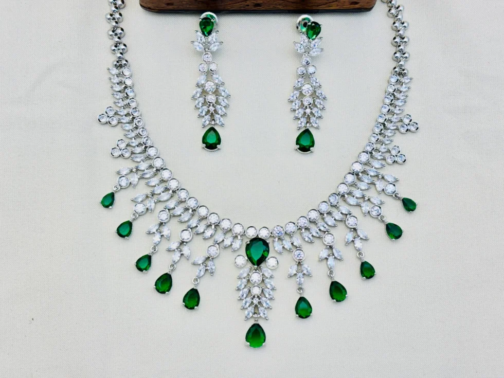 The set includes a statement necklace accompanied by matching earrings, both designed to add refined elegance to your look. The combination of shimmering white stones and emerald-green accents gives a touch of royalty and sophistication. Whether paired with a saree, lehenga, or gown, this set beautifully complements both traditional and modern attire. Lightweight, skin-friendly, and designed for comfort, it’s the perfect choice for brides, bridesmaids, or anyone who values fine craftsmanship.