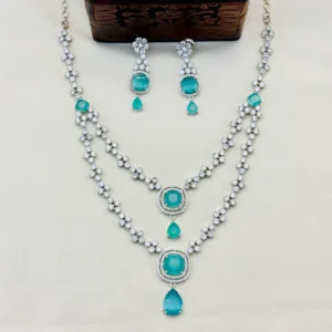 With its graceful two-layer design, cooling turquoise accents, and rhodium silver brilliance, this American Diamond Necklace Set embodies elegance and sophistication. A must-have addition to your jewelry collection, it offers the perfect balance between timeless charm and modern aesthetics — a statement of class for every occasion.