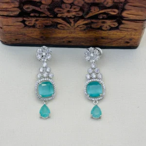 This American Diamond necklace set is a celebration of simplicity, grace, and luxury. It is perfect for those who prefer jewelry that makes a statement without being overwhelming. The contrast between the icy white stones and calming turquoise gems adds a refreshing sophistication, making it suitable for both daytime and evening wear.