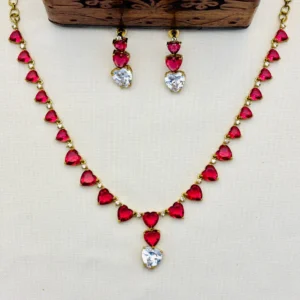 Experience the allure of royal elegance with the American Diamond Victorian Finish Heart Stone Necklace Set in Red Stone, a statement of timeless beauty and vintage sophistication. Crafted with precision and passion, this jewelry set combines the fiery brilliance of red American Diamonds with the antique charm of Victorian finish — perfect for women who love jewelry that radiates regal confidence and grace.