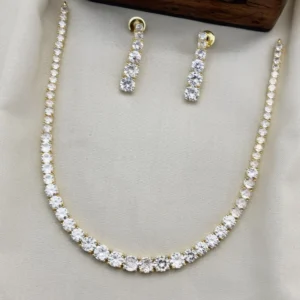 Elegant gold polish CZ necklace set with matching earrings, beautifully crafted with sparkling cubic zirconia stones for a rich diamond-like shine. Designed to enhance your style for every special occasion, this jewellery set is perfect for weddings, parties, festive celebrations, Christmas gifting, as well as traditional events like Eid and Diwali. Lightweight, comfortable, and stylish, it adds a touch of luxury and elegance to both ethnic and modern outfits, making it a must-have addition to your jewellery collection.