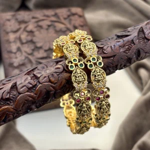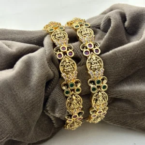 Add a touch of divine beauty to your ethnic look with these Matte Gold Traditional Laxmi Design Bangles from Kasim Jewellers. Crafted from high-quality brass and adorned with sparkling American diamond stones, these bangles showcase the elegance of traditional Indian craftsmanship. The detailed Laxmi motif symbolizes prosperity and blessings, making it perfect for festive occasions, weddings, and temple wear.