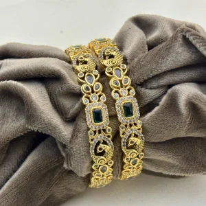 Add a royal touch to your look with these Matte Gold Peacock Design Bangles from Kasim Jewellers. Made from high-quality brass, these bangles feature an elegant peacock design decorated with shining CZ and Kundan stones. The matte gold finish gives a traditional, rich, and elegant style, perfect for weddings, temple wear, parties, and festive occasions.