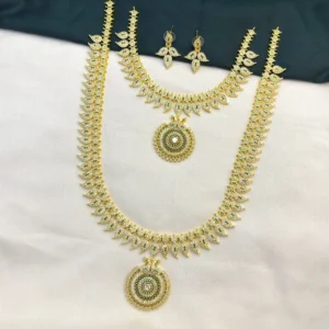 Bring home the beauty of timeless South Indian tradition with this Traditional Mango CZ Stone Haram Necklace Set from KasimJewellers. Designed with elegant mango (maanga) motifs and sparkling Cubic Zirconia stones, this long haram necklace gives a rich temple jewellery look that perfectly complements sarees, lehengas, and bridal outfits.